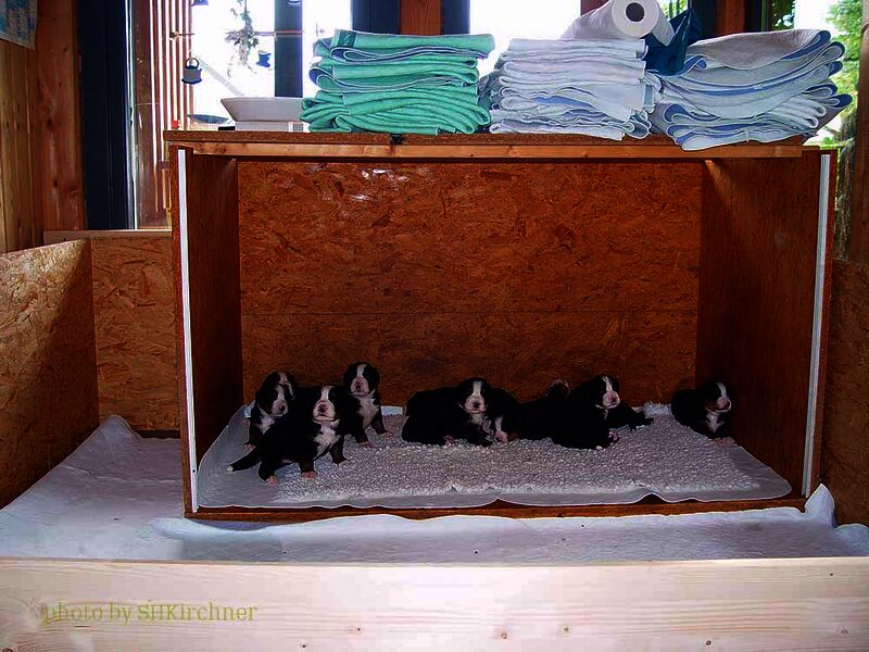 Danach verlief alles wie im Bilderbuch. Bis nachmittags um 14:15 Uhr waren zehn wunderschöne Bernerbabys geboren. Unsere Chira hat die Welpen in den ersten drei Wochen komplett selbstständig versorgt was bei zehn Welpen nicht immer der Fall ist.
