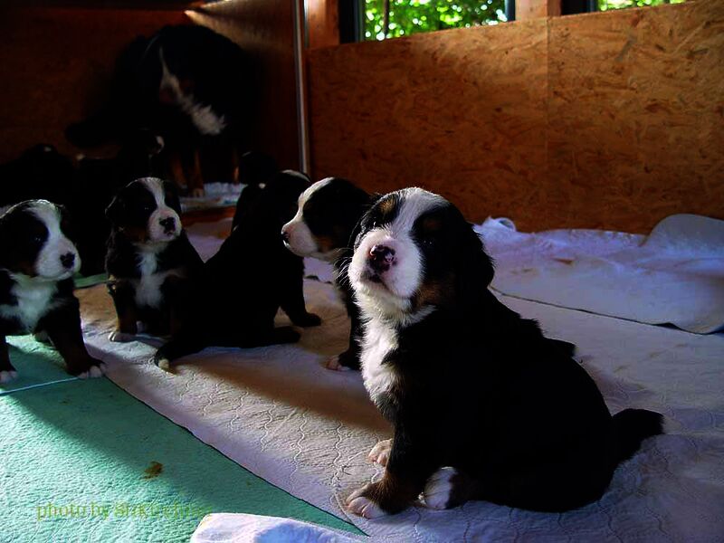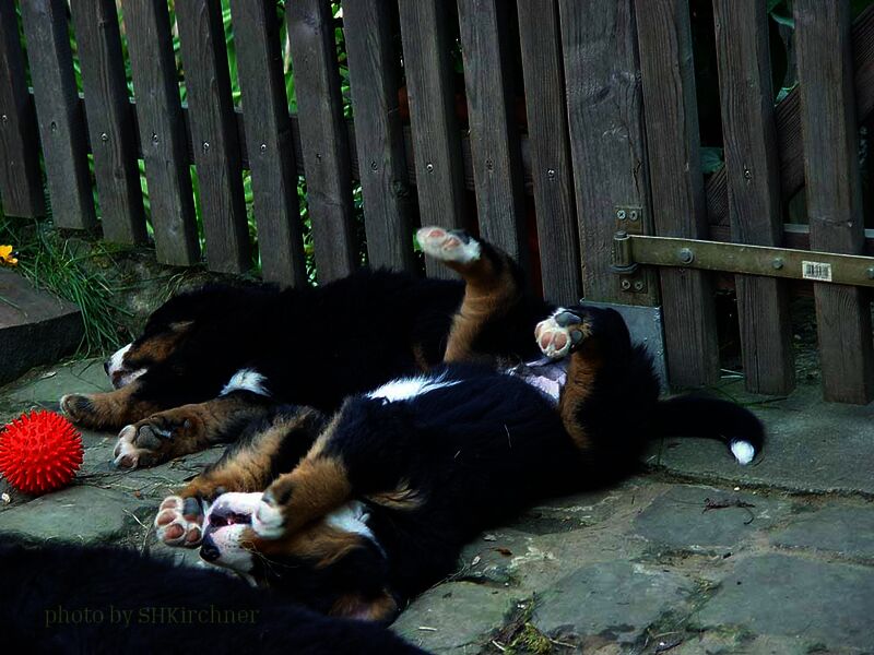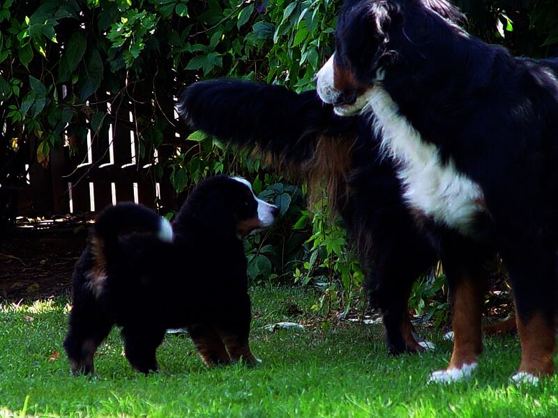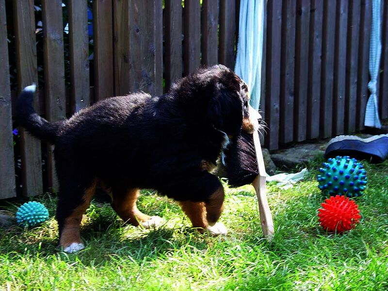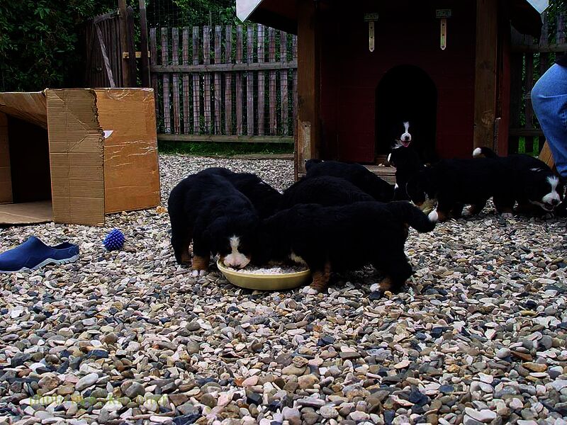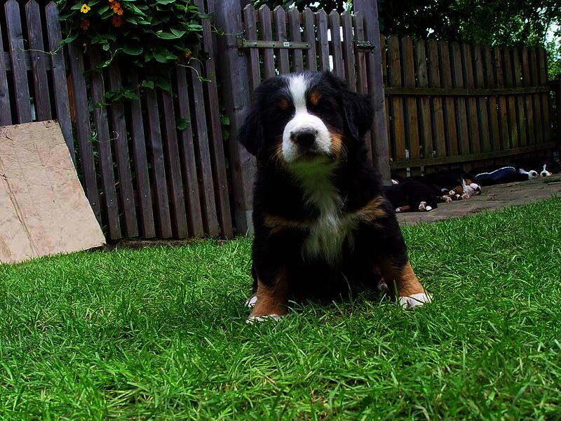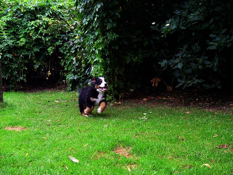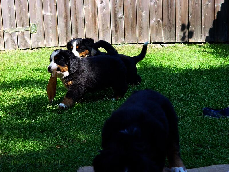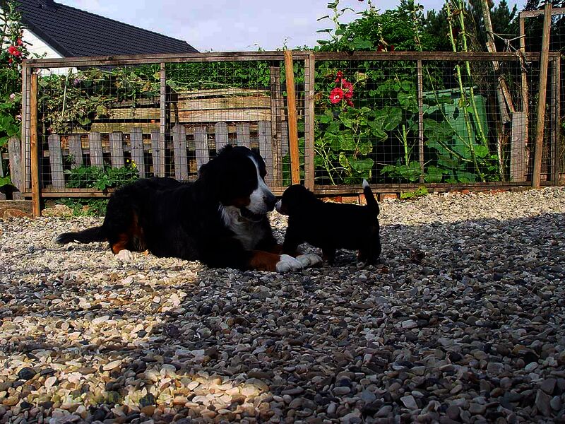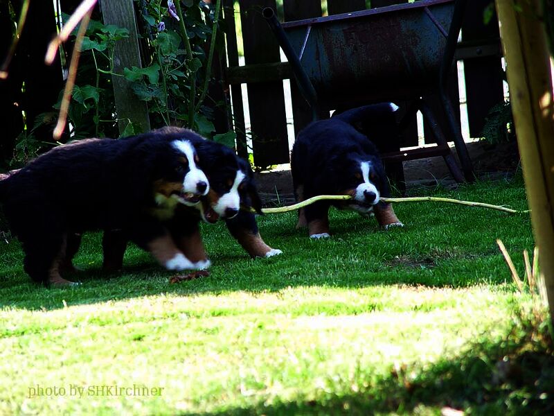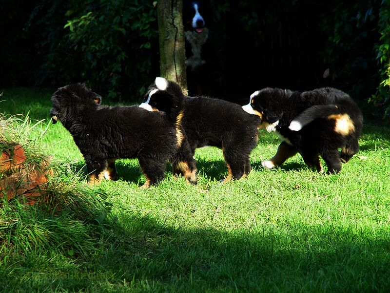 Die Aufzucht der Welpen verlief ohne Probleme. Mit vier Wochen haben die Welpen dann unseren Garten erobert. Zu dieser Zeit fing es auch an, das dass Interesse an unseren Katzen wuchs. Im laufe der nächsten Wochen lernten die Kleinen all das, was ein kleiner Berner wissen muss, wenn er ein neues zu Hause erobern will.