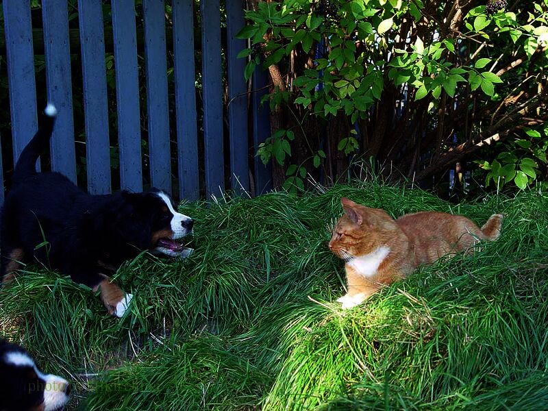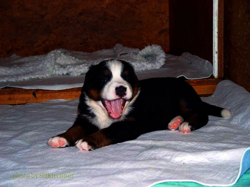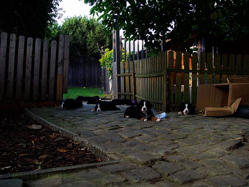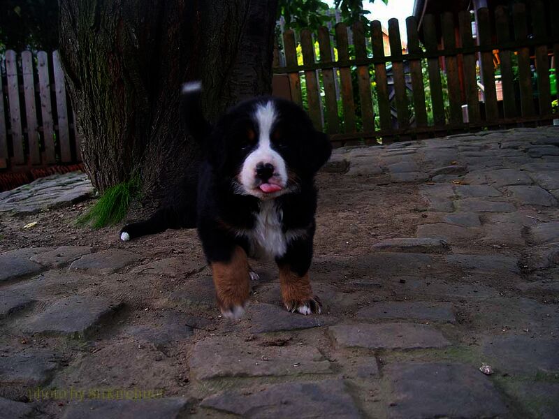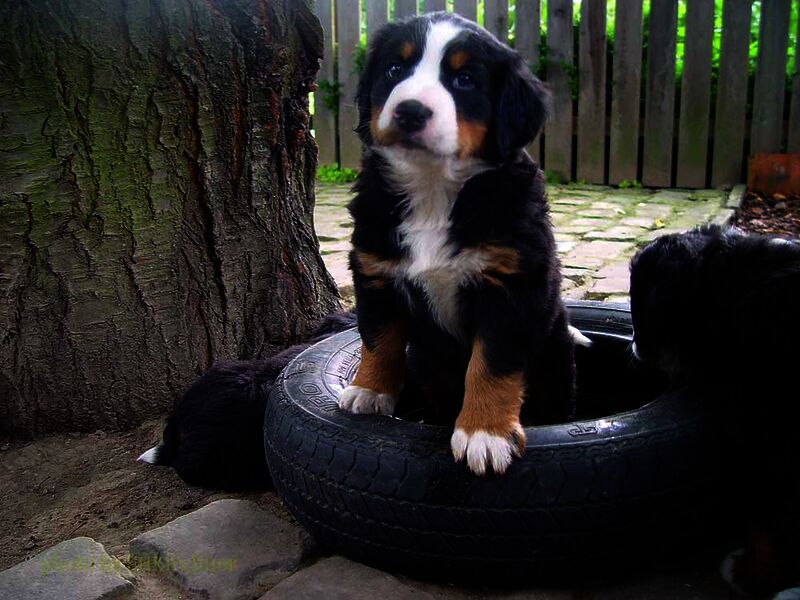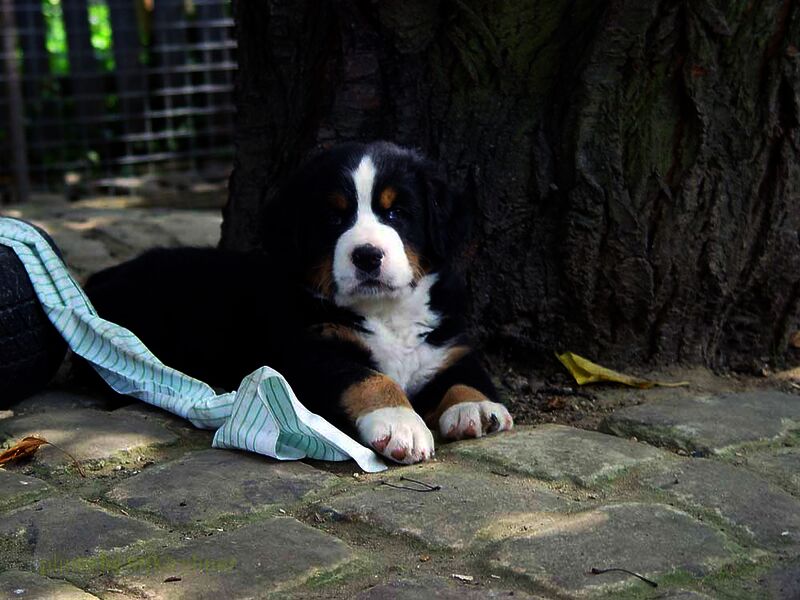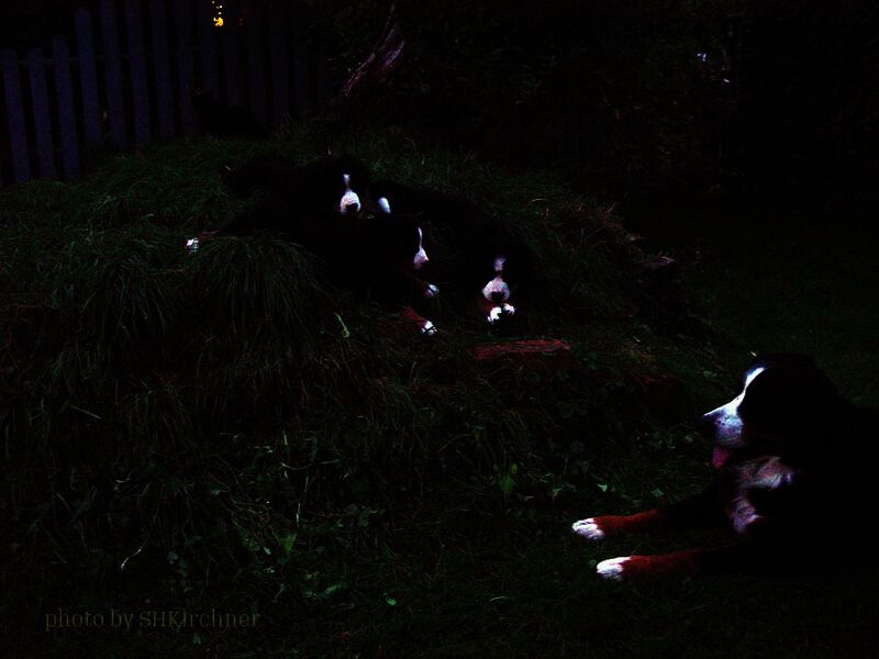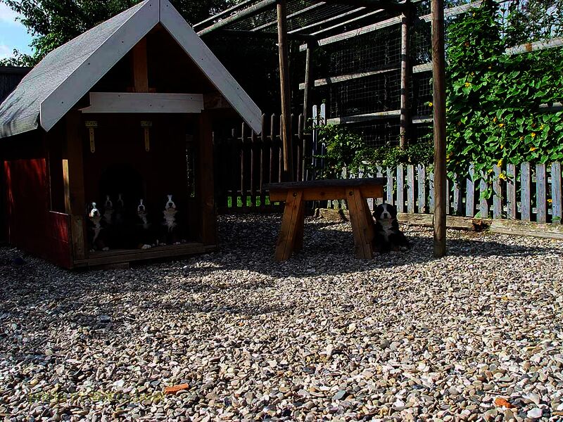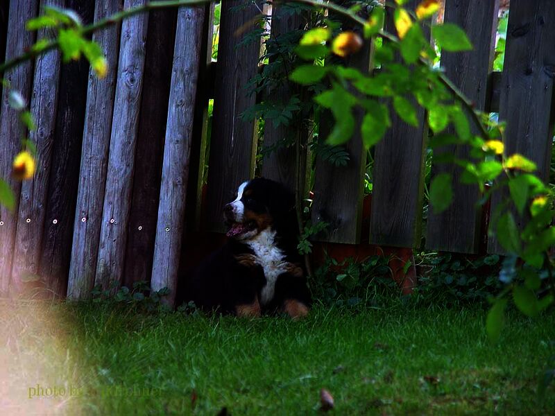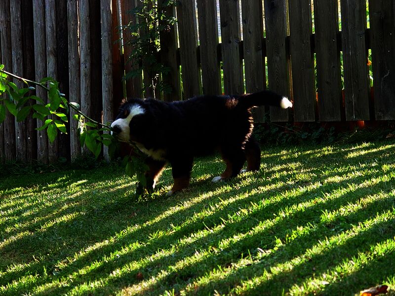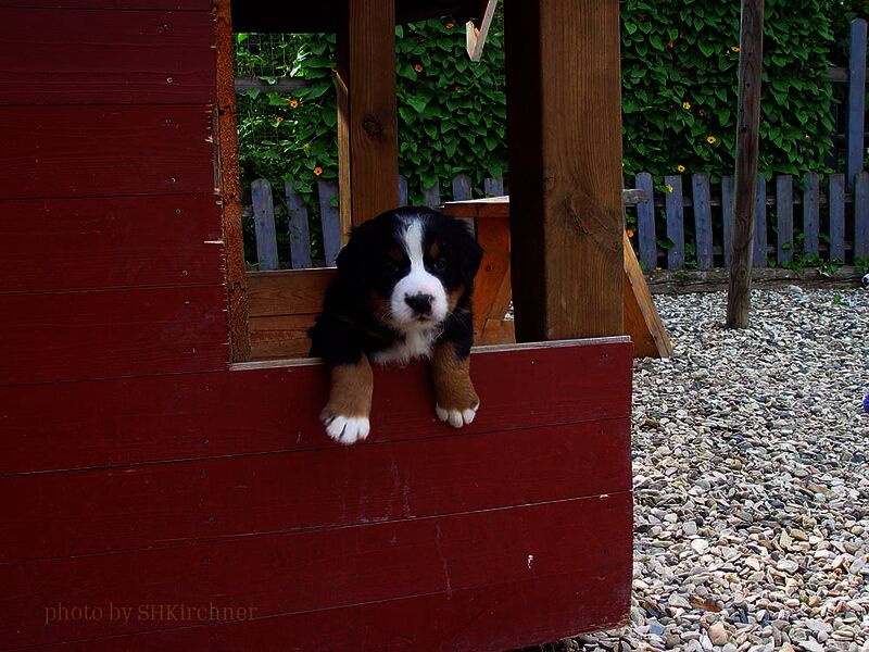 Die Aufzucht der Welpen verlief ohne Probleme. Mit vier Wochen haben die Welpen dann unseren Garten erobert. Zu dieser Zeit fing es auch an, das dass Interesse an unseren Katzen wuchs. Im laufe der nächsten Wochen lernten die Kleinen all das, was ein kleiner Berner wissen muss, wenn er ein neues zu Hause erobern will.