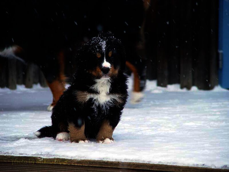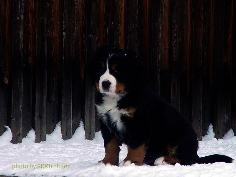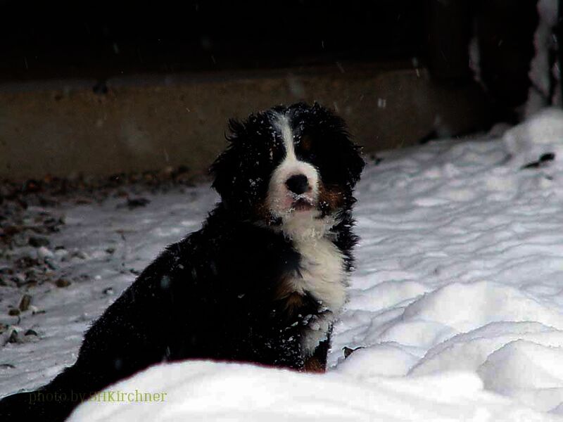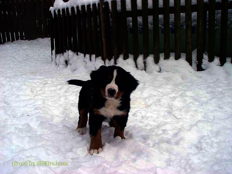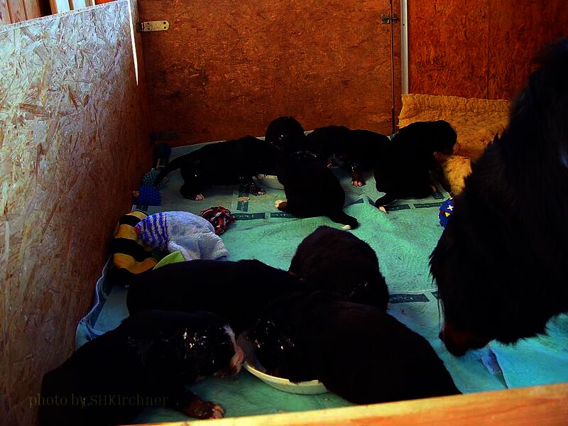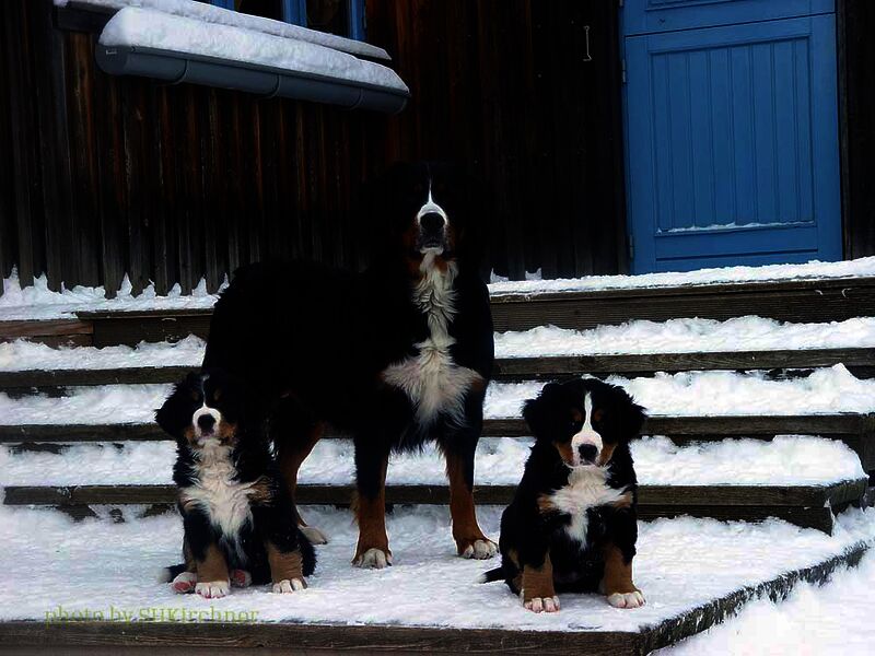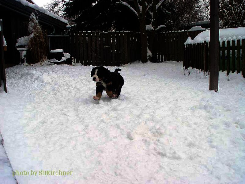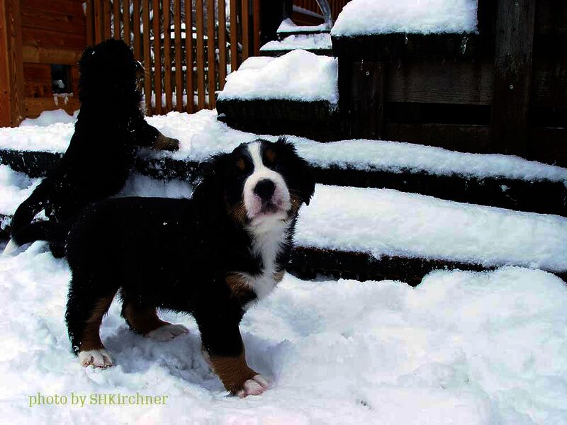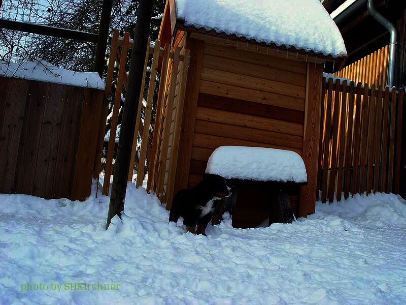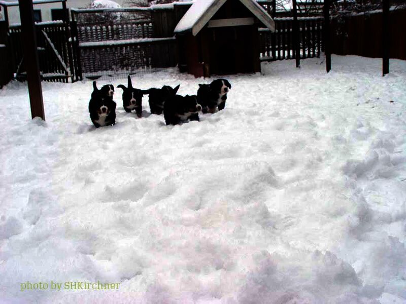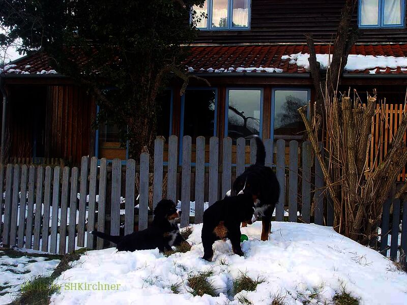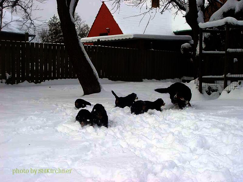 Das heißt sie wuchsen im Wohnzimmer inmitten des ganzen Hunde - Menschenrudels auf. Mit drei Wochen zogen sie dann ein paar Meter weiter in den Wintergarten. Von dort aus konnten sie jederzeit in den Garten um dort im Schnee zu toben. Während der ganzen Zeit bestand ständig wechselnder Kontakt zu Menschen und auch zu fremden Hunden. Da sie ja in unserer Mitte lebten lernten sie innerhalb der 8 Wochen was ein Hundekind wissen muss um ein gutes Leben bei seiner neuen Familie zu führen.