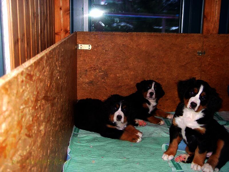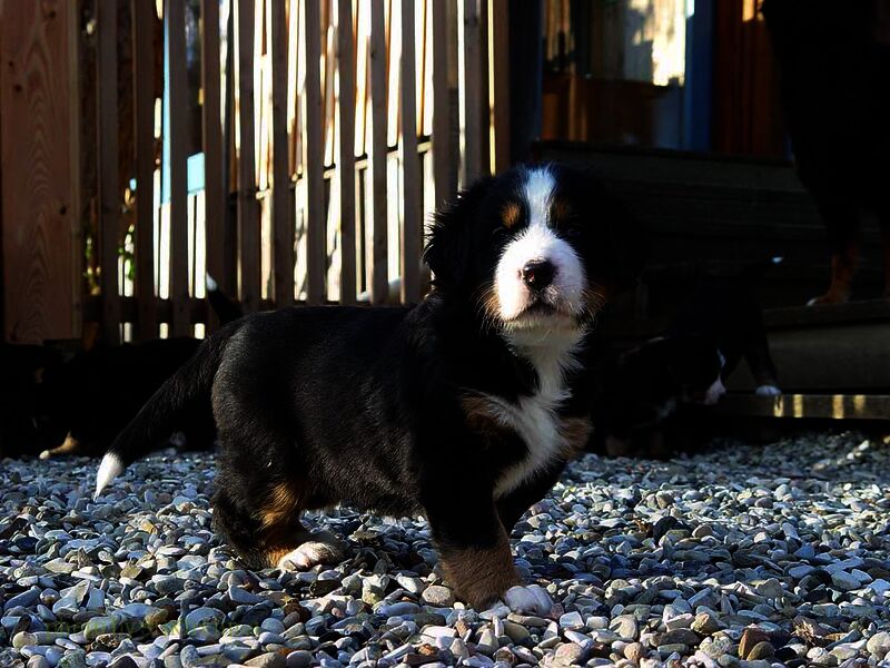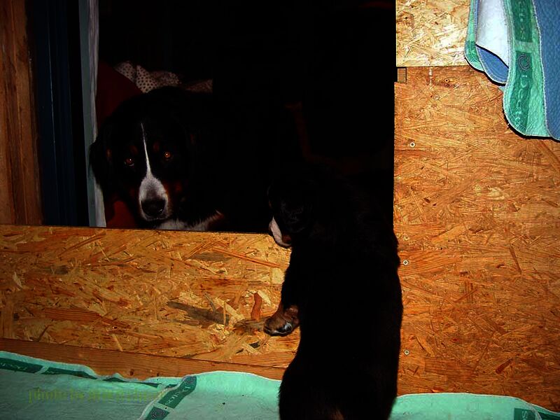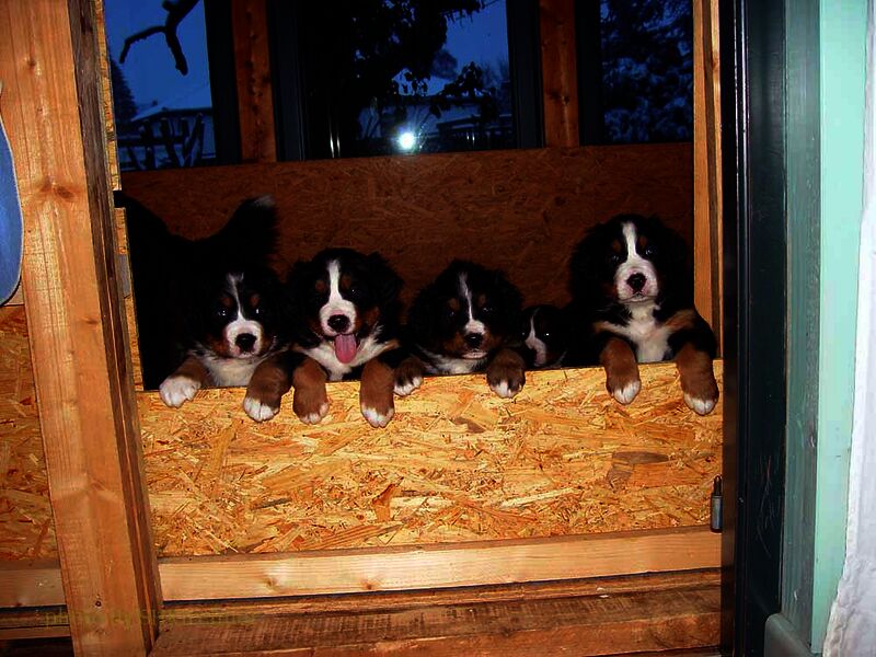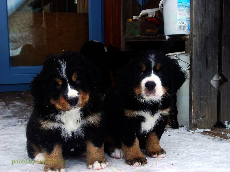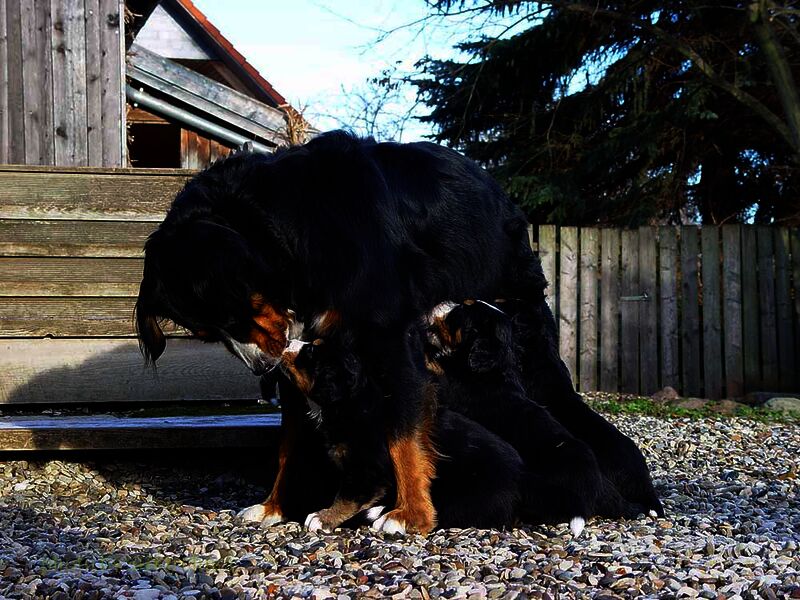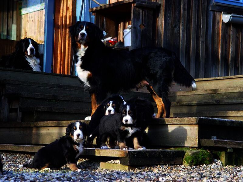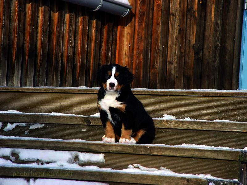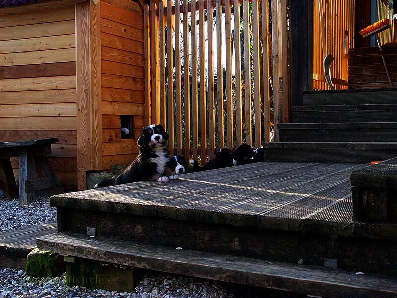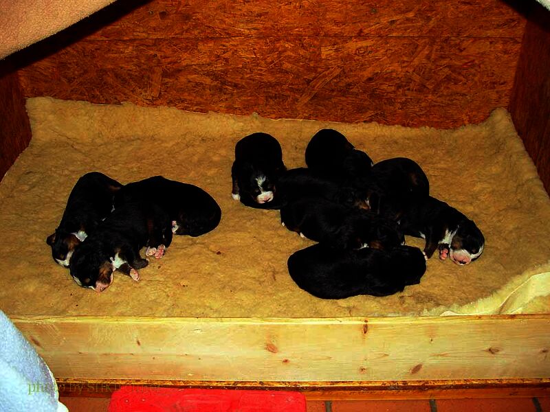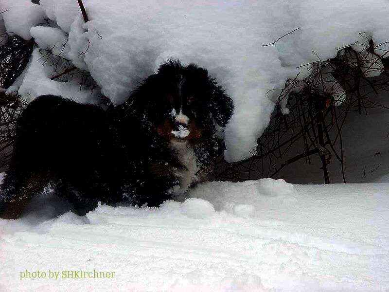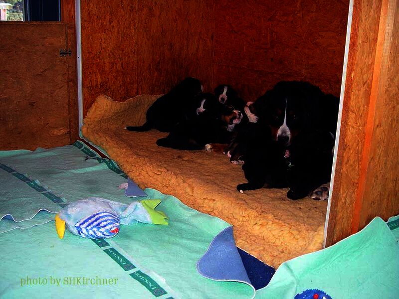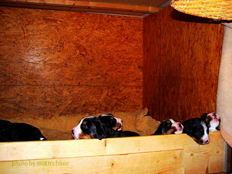 Das heißt sie wuchsen im Wohnzimmer inmitten des ganzen Hunde - Menschenrudels auf. Mit drei Wochen zogen sie dann ein paar Meter weiter in den Wintergarten. Von dort aus konnten sie jederzeit in den Garten um dort im Schnee zu toben. Während der ganzen Zeit bestand ständig wechselnder Kontakt zu Menschen und auch zu fremden Hunden. Da sie ja in unserer Mitte lebten lernten sie innerhalb der 8 Wochen was ein Hundekind wissen muss um ein gutes Leben bei seiner neuen Familie zu führen.