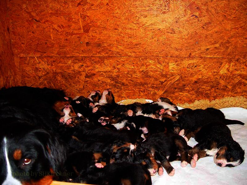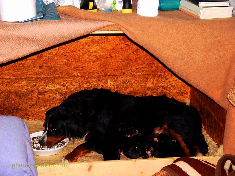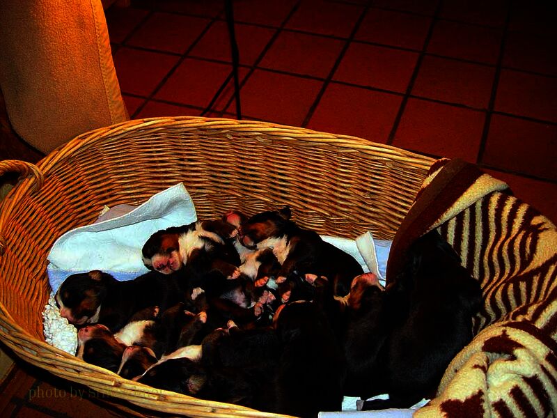 Am Freitag den 24. und am Sonntag den 26. September 2010 hatten Lotti und Basco ein nettes Stelldichein und 64 Tage später wurden 13 wunderschöne Welpen geboren. Mit 13 Welpen hatten wir natürlich nicht gerechnet. So viele hatten wir in unserer ganzen Züchterlaufbahn noch nicht. Für uns war ganz klar das wir von Anfang an unsere Lotti unterstützen müssen und so haben wir ab dem ersten Tag vier mal am Tag zugefüttert. Soviel Zeit wie in den ersten drei Wochen haben wir noch nie auf dem Sofa verbracht. Eigentlich saß immer einer mit einem Welpen auf dem Schoss und fütterte. Mit drei Wochen haben die Welpen dann selber gefressen und wir konnten das Sofa verlassen.