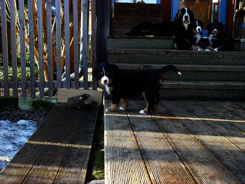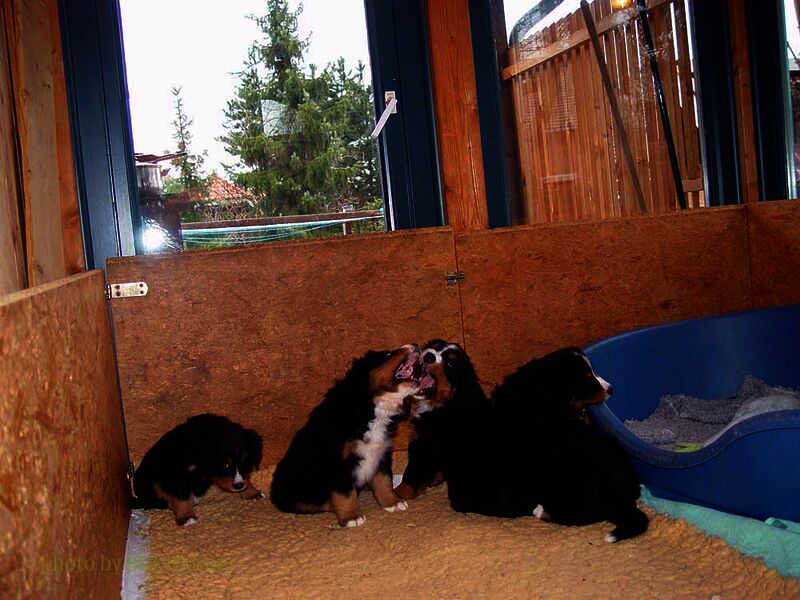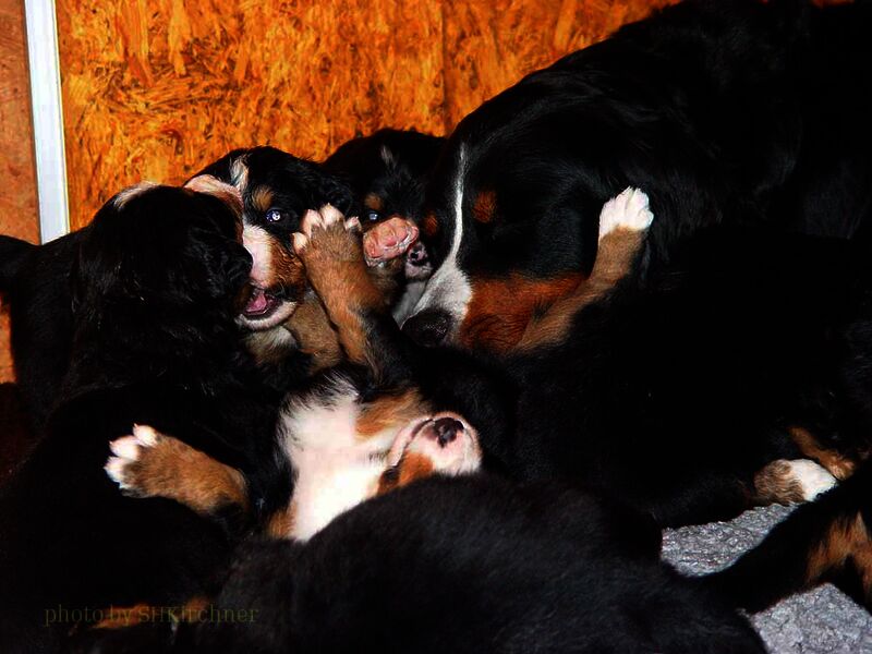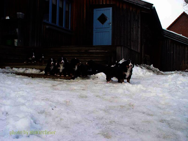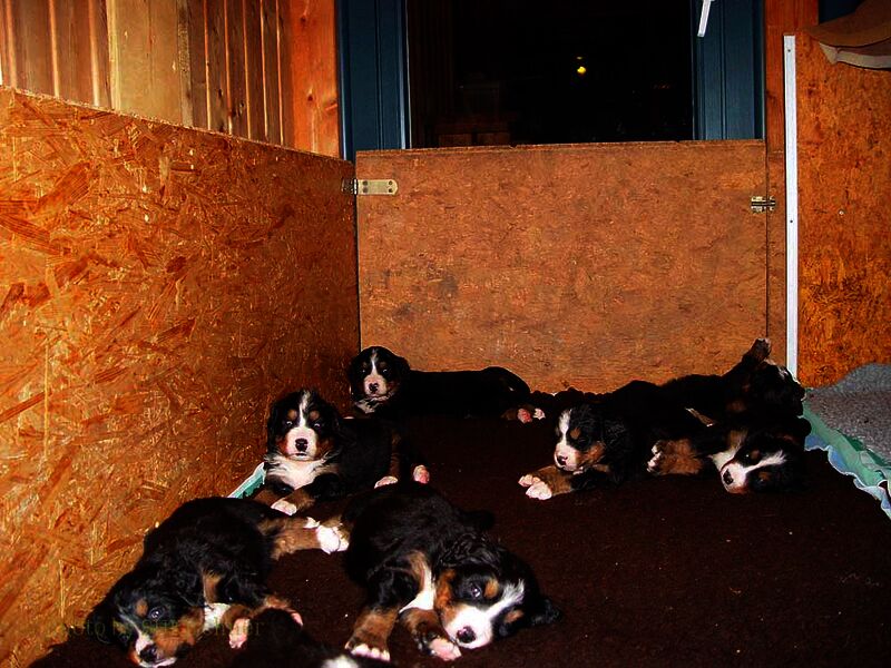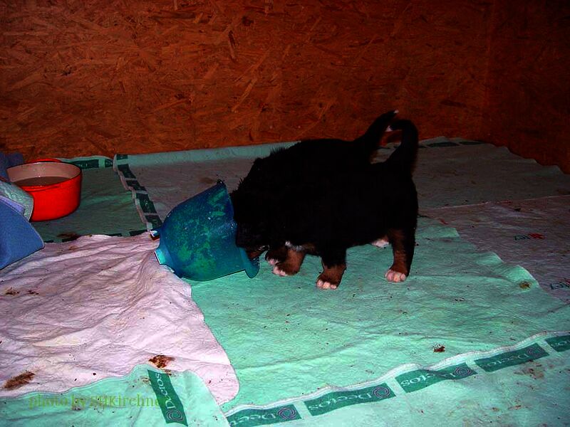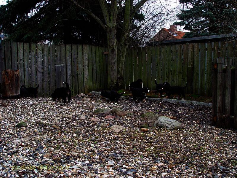 In den nächsten Wochen wuchsen die Welpen ohne Komplikationen auf und lernten jeden Tag etwas Neues dazu. Da es so viele Welpen waren hatten wir eigentlich jeden Tag Besuch und die Welpen somit jede Menge verschiedene Menschen um sich welche zum Teil eigene Hunde zwecks neuer Familienzusammenführung mitbrachten.