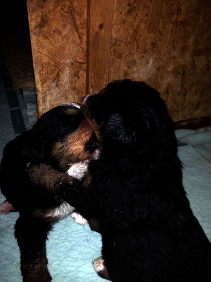 Leider haben wir am zweiten Tag einen Welpen verloren. Stina war unachtsam und hatte sich falsch hingelegt und Urs dabei erdrückt. Für uns ein Drama. Die verbliebenen Welpen versorgte Stina vorbildlich so das wir die ersten drei Wochen nicht wirklich was zu tun hatten.