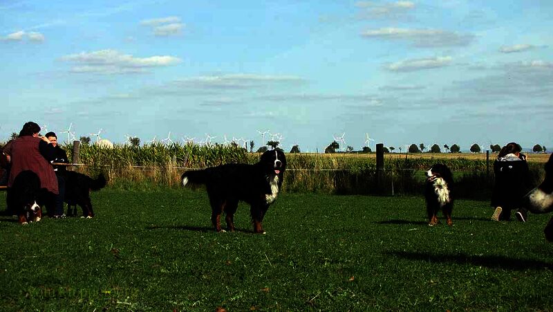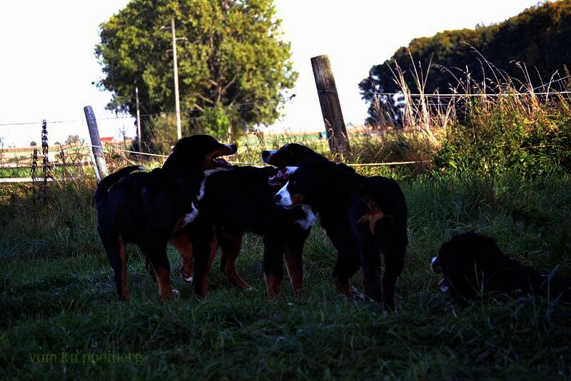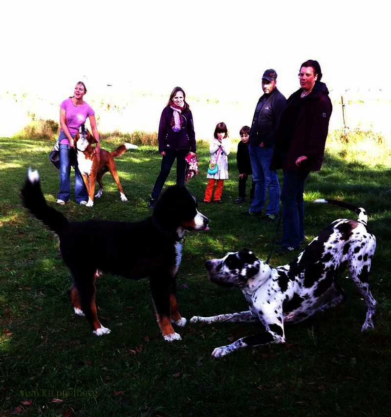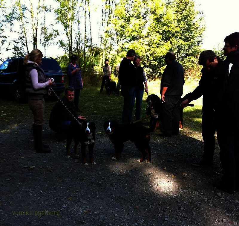 Die Welpen hatten sich etwas abseits ein Plätzchen zum spielen gesucht und nutzten die Zeit zum herumtollen. Die erwachsenen Hunde hielten sich meistens bei ihren Zweibeinern oder beim Kuchenbüfett auf um vielleicht ein Leckerchen zu ergattern. Einige nutzten die Gelegenheit einen Waldspaziergang zu unternehmen. Die Hunde haben sich alle prima verstanden und selbst die Rüden teilten sich die Bernerdamen (war ja auch für jeden eine dabei).